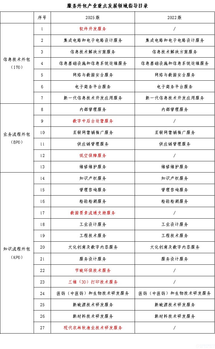 2025年10月,商务部联合多部门发布《服务外包产业重点发展领域指导目录》(2025年版)(以下简称《2025版目录》),相较2022年版本(以下简称《2022版目录》)新增软件开发服务、数字中后台运营服务、低空保障服务、数据要素流通支持服务、节能环保技术服务、三维(3D)打印技术服务、现代农林牧渔业技术研发服务等7个重点领域,调整了信息技术解决方案服务、信息基础设施和信息系统运维服务、网络与数据安全服务、电子商务平台服务、新一代信息技术开发应用服务、互联网营销推广服务、供应链管理服务、维修维护服务、知识产权服务、管理咨询服务、检验检测服务、工业设计服务、工程技术服务、文化创意及数字内容服务、医药(中医药)和生物技术研发服务、新能源技术研发服务等16个领域范畴,总领域数达27个。从《2022版目录》到《2025版目录》,清晰地勾勒出我国服务外包产业向数智化、绿色化、融合化、生态化纵深发展的战略路径。《2025版目录》通过新增领域与细化范畴,积极响应了技术变革与全球市场需求,旨在强化服务外包作为新质生产力引擎的角色。